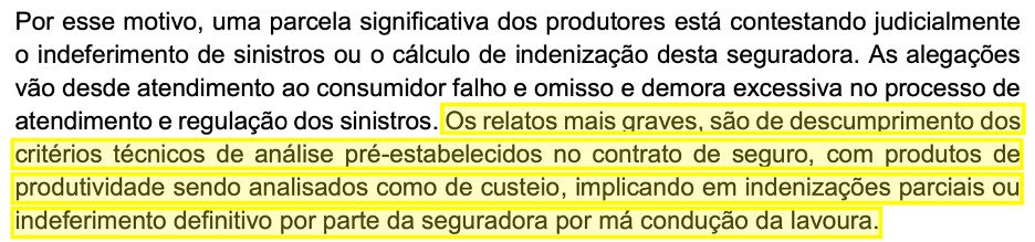 Em razão do alto número de acionamento de seguro rural, começou a demora na regulação dos sinistros. Segundo a nota, muitos produtores precisaram aguardar até cinco meses para ter o primeiro retorno da seguradora.