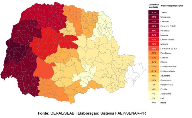 A Nota, elaborada por Ana Paula Kowalski, segue apresentando os danos causados pelos efeitos climáticos, que levaram à perdas generalizadas de 82% no extremo oeste do Paraná, segundo dados do DERAL e Conab. Veja, abaixo, o mapa de intensidade de perdas de produção no Paraná, na safra de soja 21/22:
