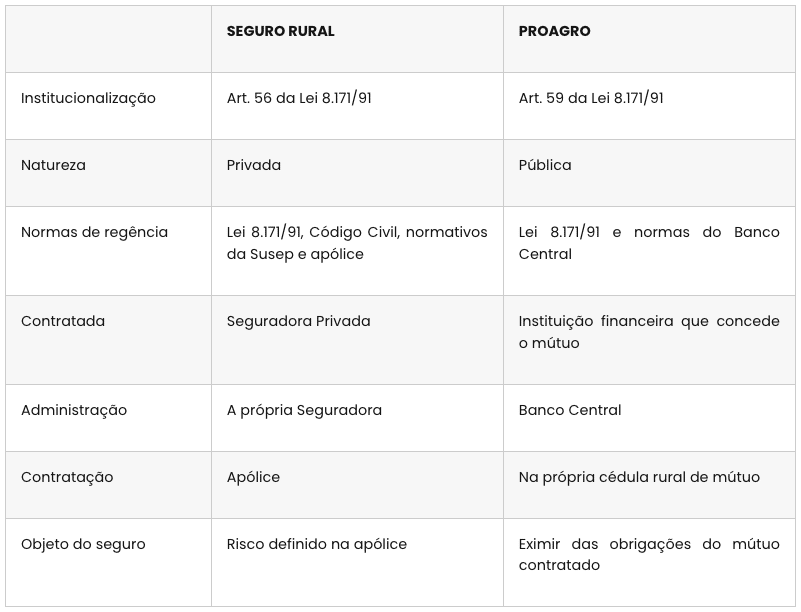 Portanto, pode-se conceituar que o Proagro é um seguro de natureza pública, que se refere à exoneração de obrigações financeiras do produtor-segurado. Já o seguro rural é um seguro de natureza privada que tem por objetivo a indenização dos prejuízos previstos na apólice.