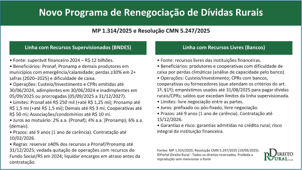 - Linha de recursos livres (instituições financeiras) – sem limite global; com condições de juros, garantias e limites negociados diretamente entre produtor e banco; prazo de até 9 anos, com carência de 1 ano; e contratação até 15/12/2026.
